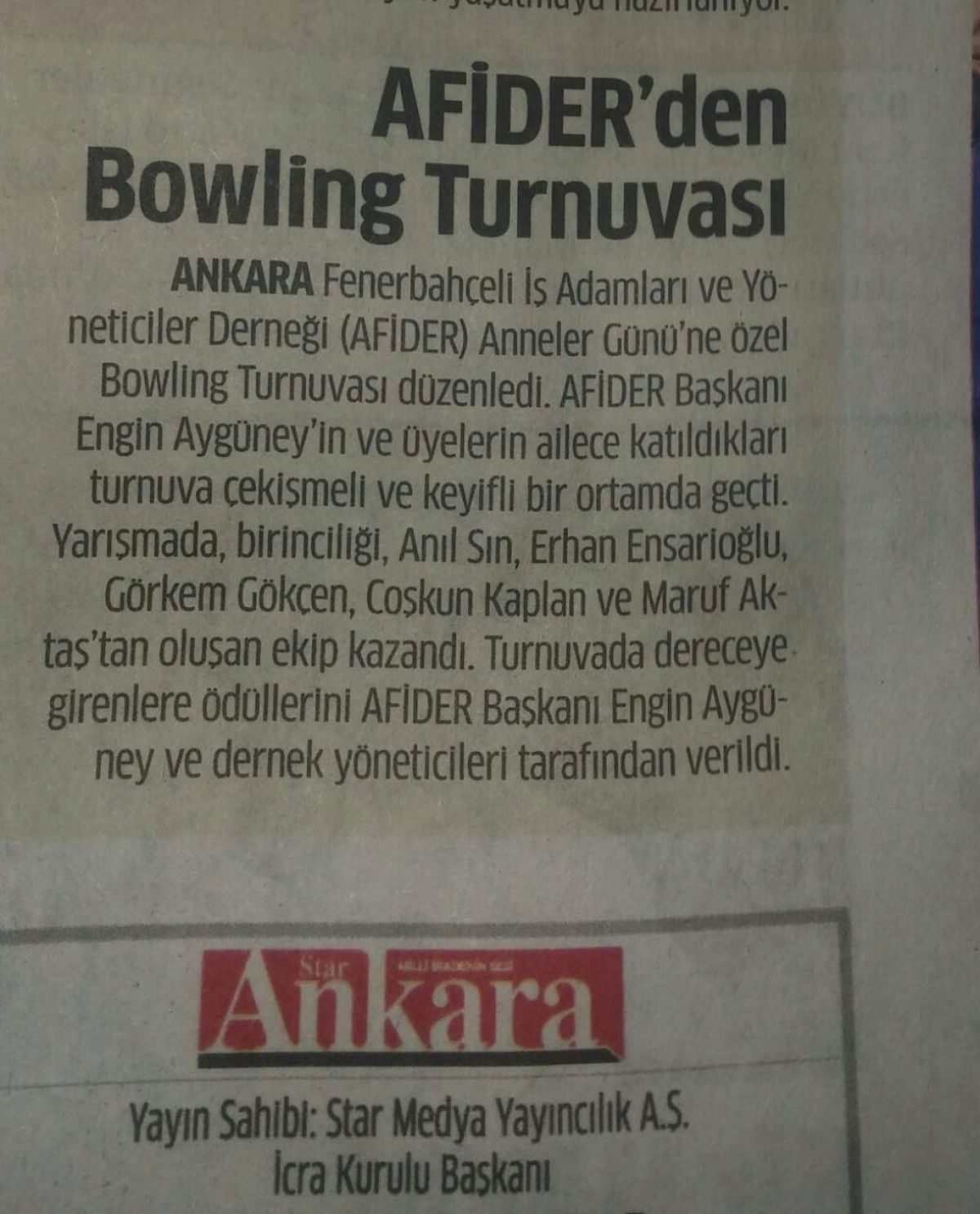 Afider Birinci Bowling Turnuvamız Bilkent Roll House'da 5'er kişilik 8 grup ile gerçekleşti. Tüm katılımcılarımıza teşekkür eder, ilk üçe giren grupları kutlarız...
